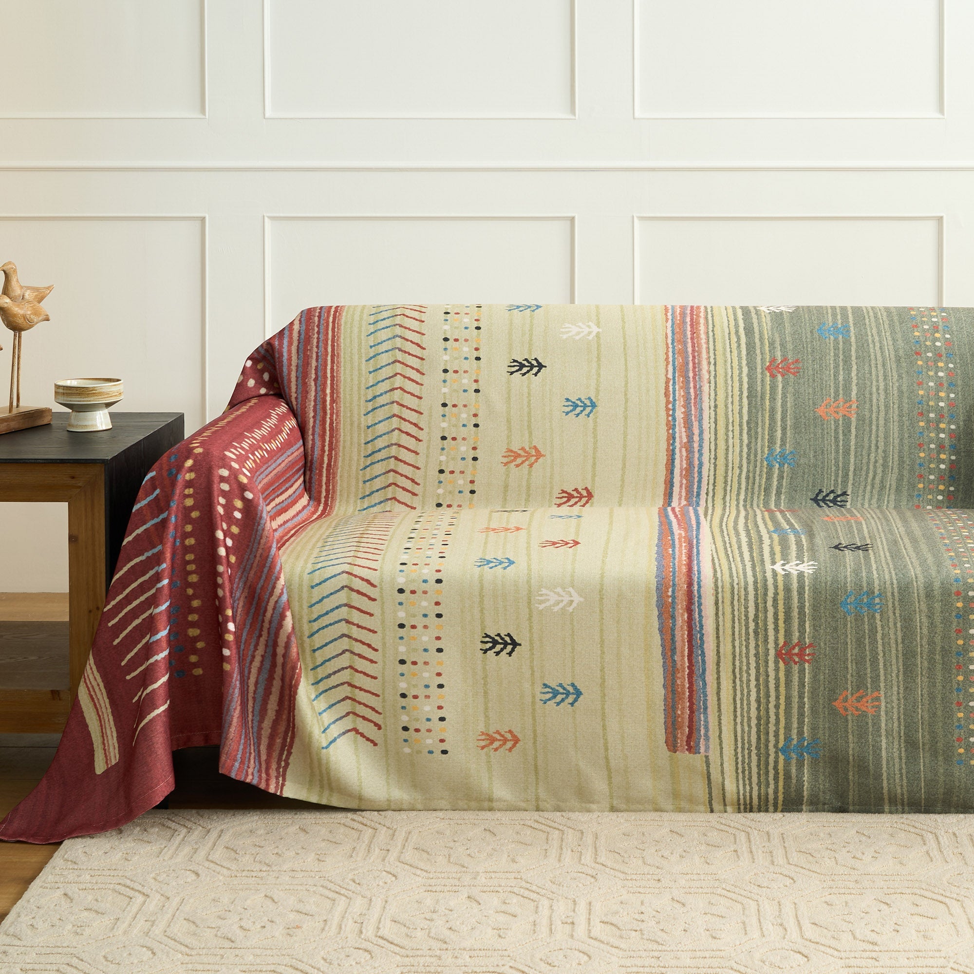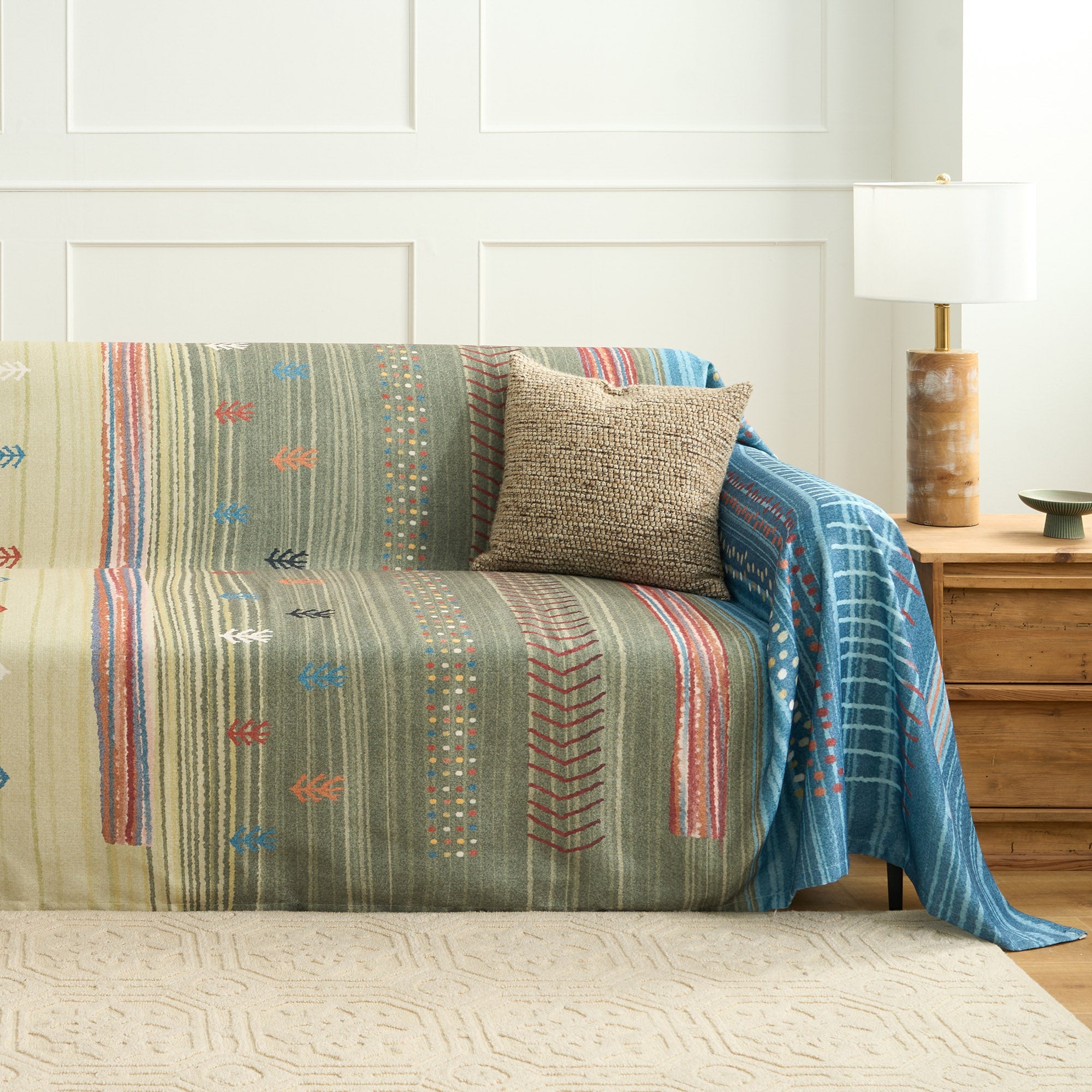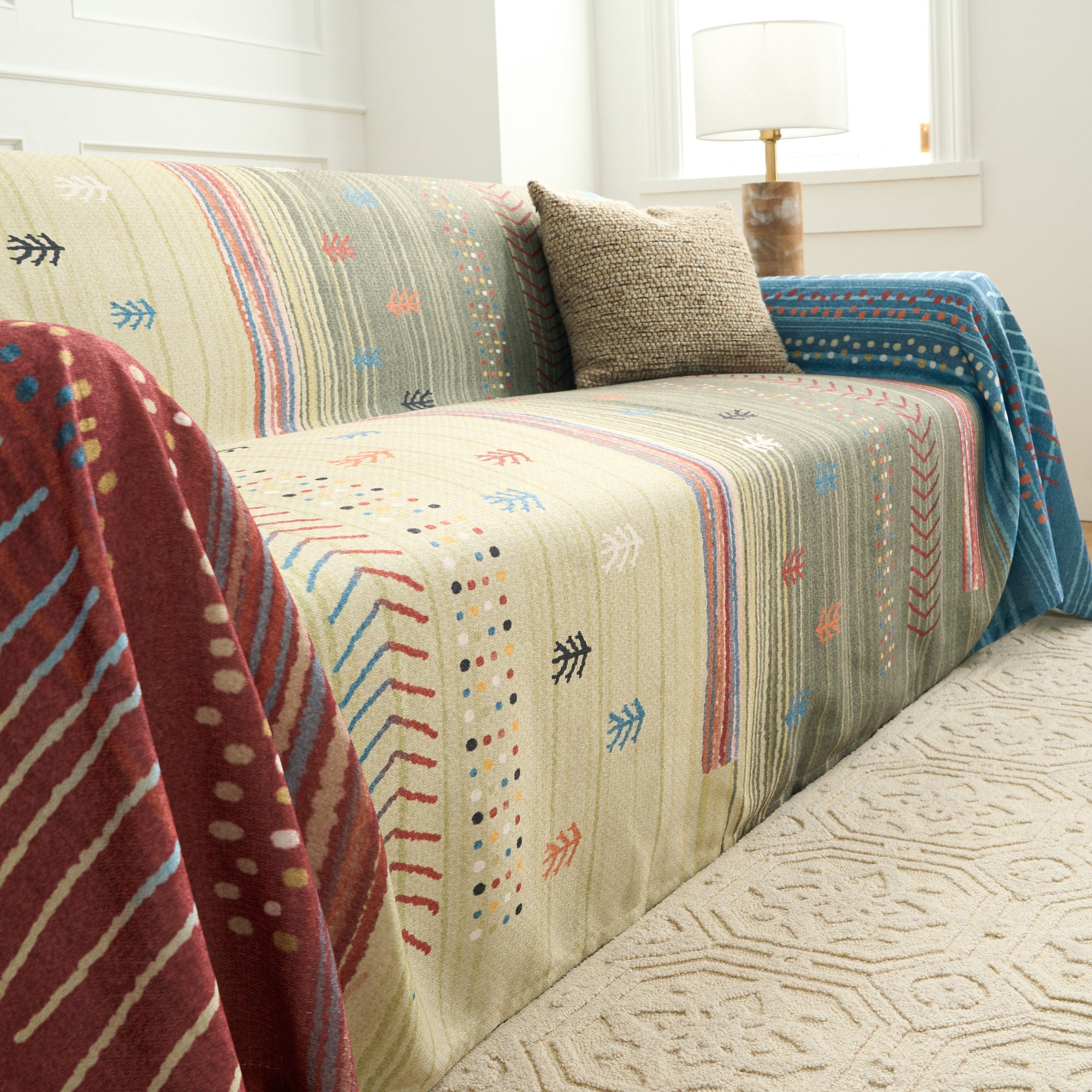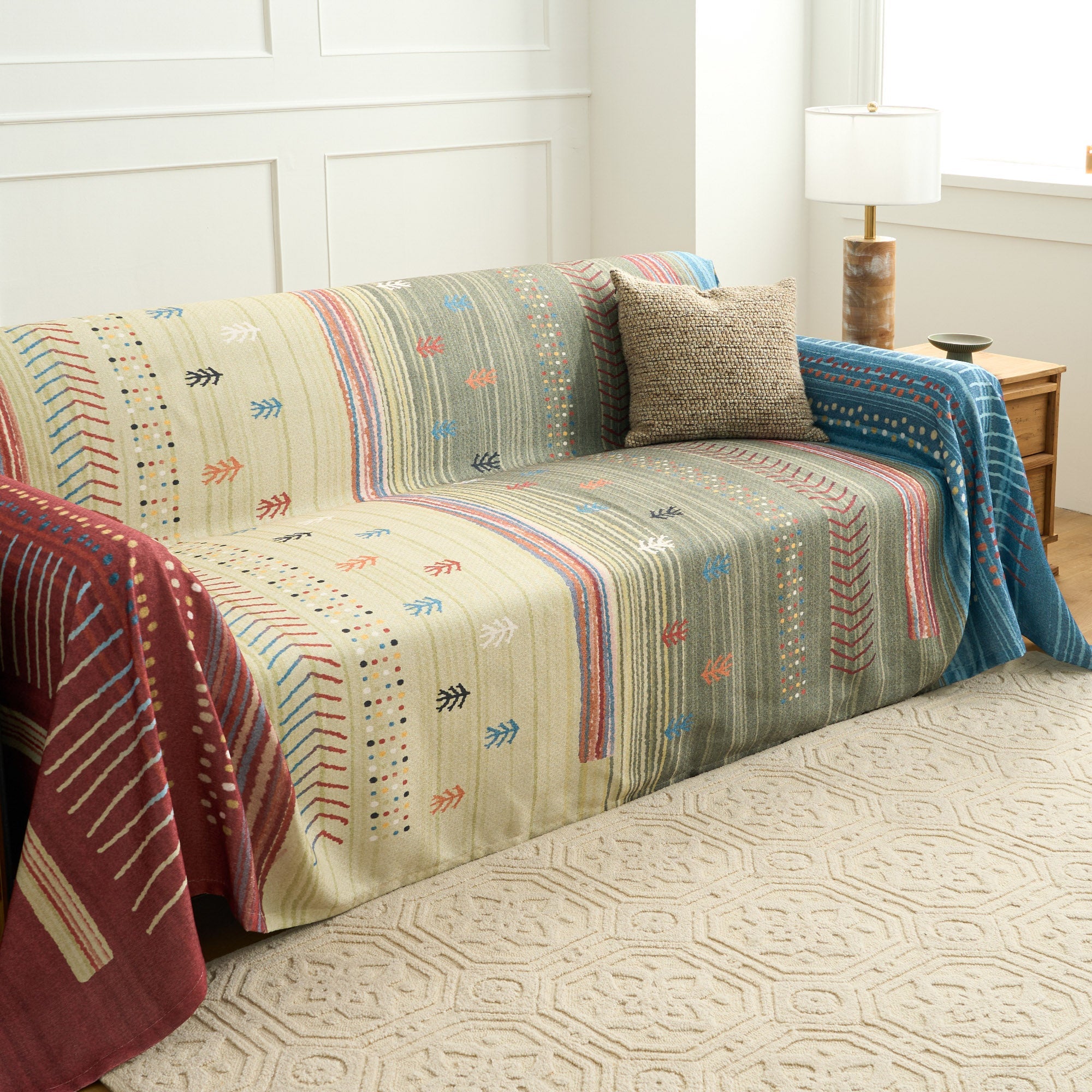 Bringen Sie die Wärme der Natur in Ihr Zuhause mit diesem erdfarbenen, gestreiften Sofabezug. Die reiche Mischung aus Erdtönen, kombiniert mit subtilen geometrischen Mustern, sorgt für einen gemütlichen, einladenden Look, der zu einer Vielzahl von Einrichtungsstilen passt. Diese aus strapazierfähigem, weichem Stoff gefertigte Hülle verbessert nicht nur die Ästhetik Ihres Raums, sondern bietet auch eine Schutzschicht für Ihre Möbel. Diese Hülle ist ideal, um eine entspannte, böhmische Atmosphäre zu schaffen. Sie ist die perfekte Ergänzung für jeden Wohnraum, der einen Hauch natürlicher Eleganz sucht.