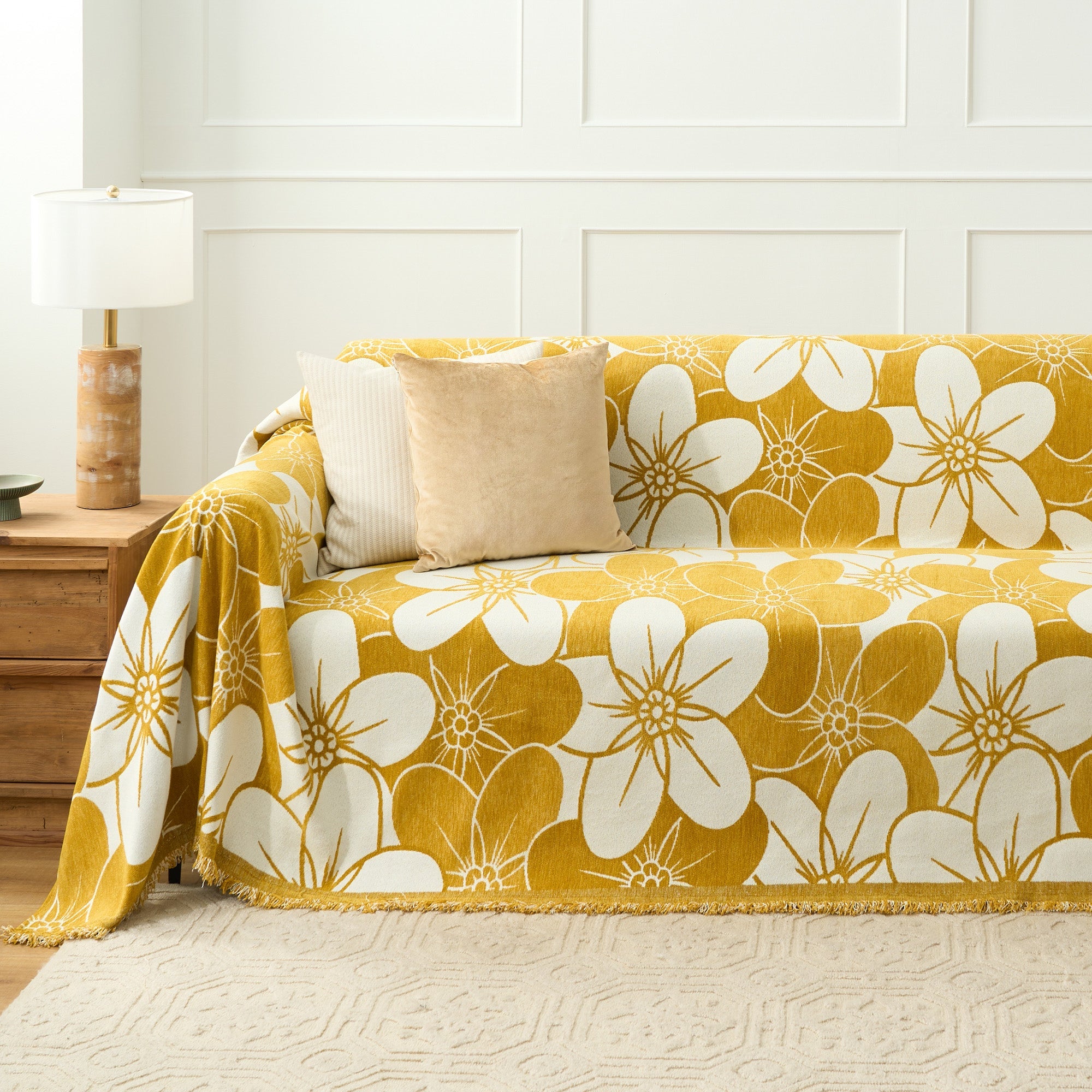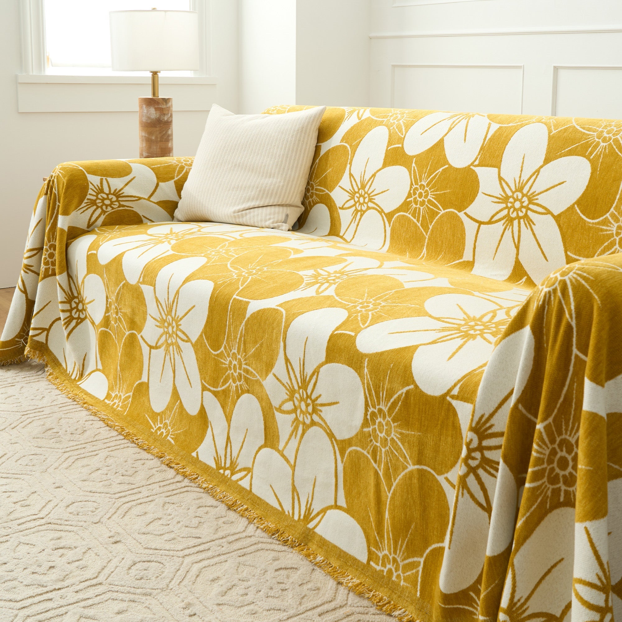 Verleihen Sie Ihrem Wohnraum mit dem Sofabezug Floral Elegance einen Hauch natürlicher Schönheit. Mit einem faszinierenden großen Blumenmuster in ruhigen Blautönen verwandelt dieser Bezug Ihr Sofa in ein auffälliges Stück und bietet gleichzeitig zuverlässigen Schutz. Das zarte Fransendetail sorgt für einen Hauch von Textur und ist damit die perfekte Wahl für alle, die Komfort und Stil nahtlos miteinander verbinden möchten.