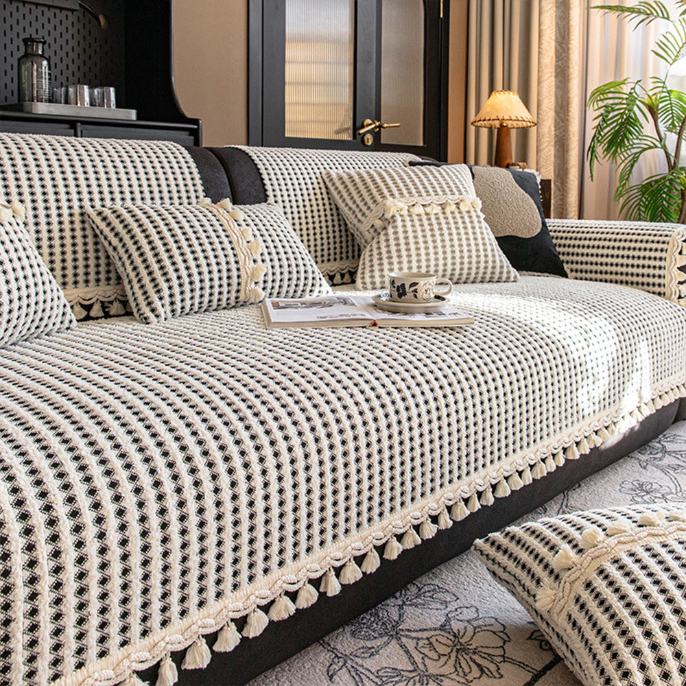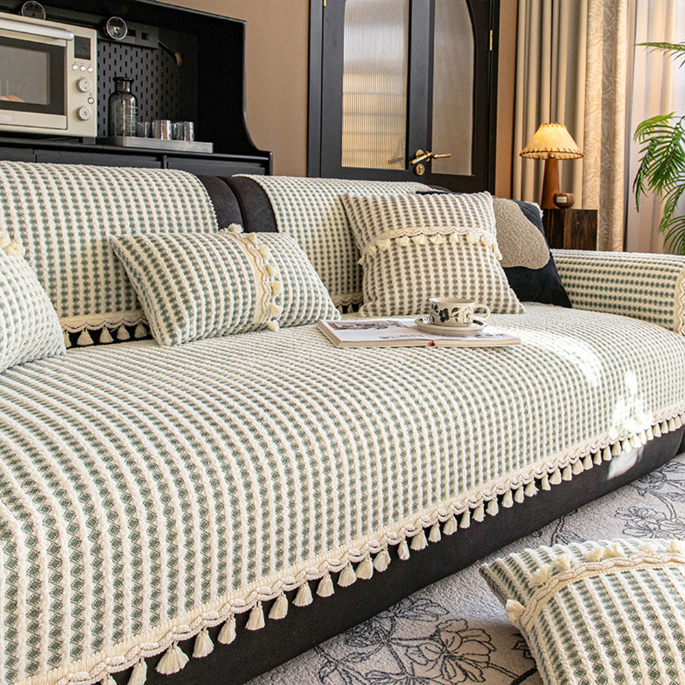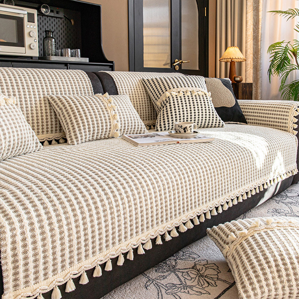 Verleihen Sie Ihrem Wohnraum mit unserem rutschfesten Sofabezug aus Chenille mit raffiniertem Gittermuster und Quasten einen Hauch von dezentem Luxus. Das Design besticht durch eine klare, minimalistische Gitterstruktur und eine zarte, geradlinige Quastenborte und vereint moderne Schlichtheit mit raffinierter Eleganz – perfekt für Ledersofas und zeitgemäße Einrichtungen.