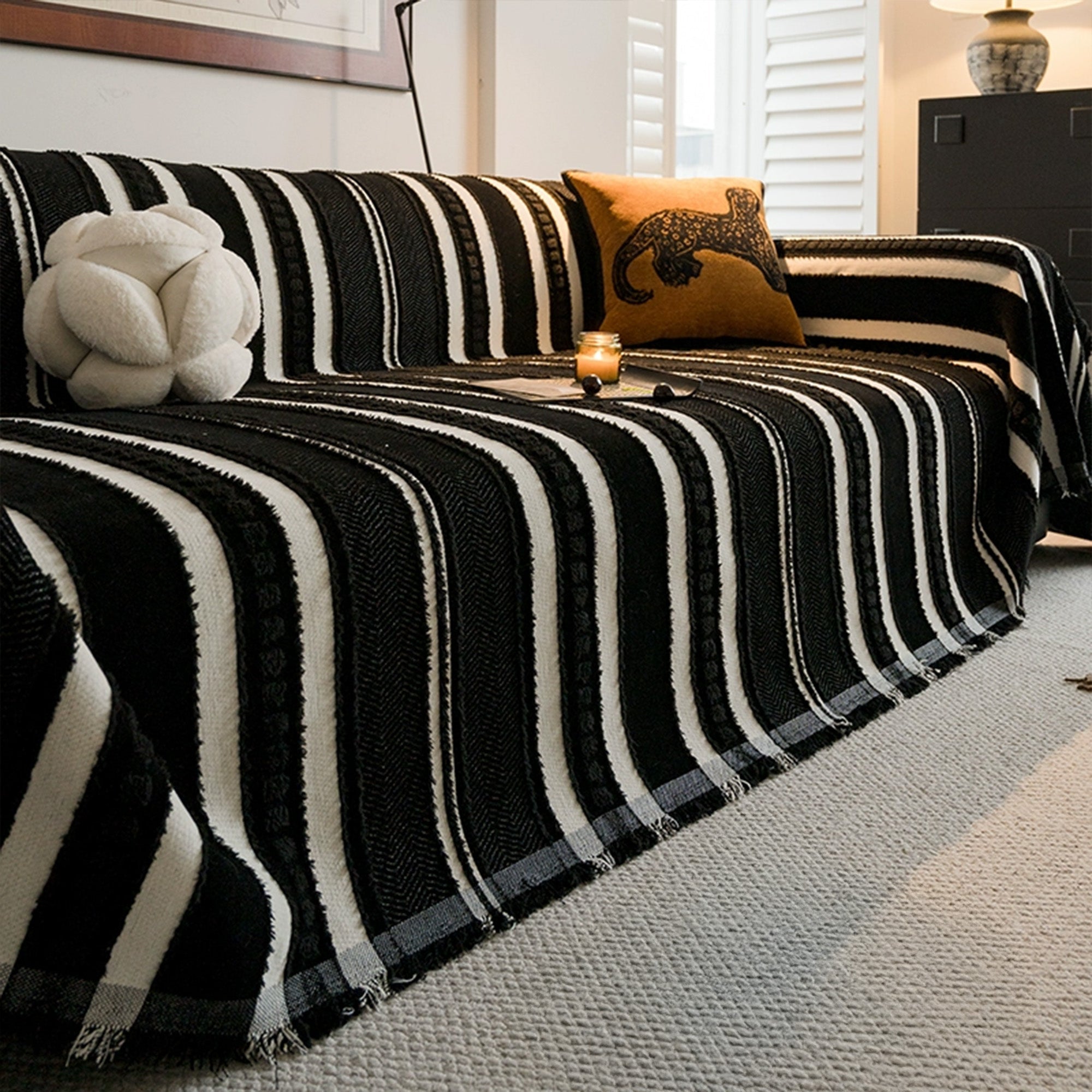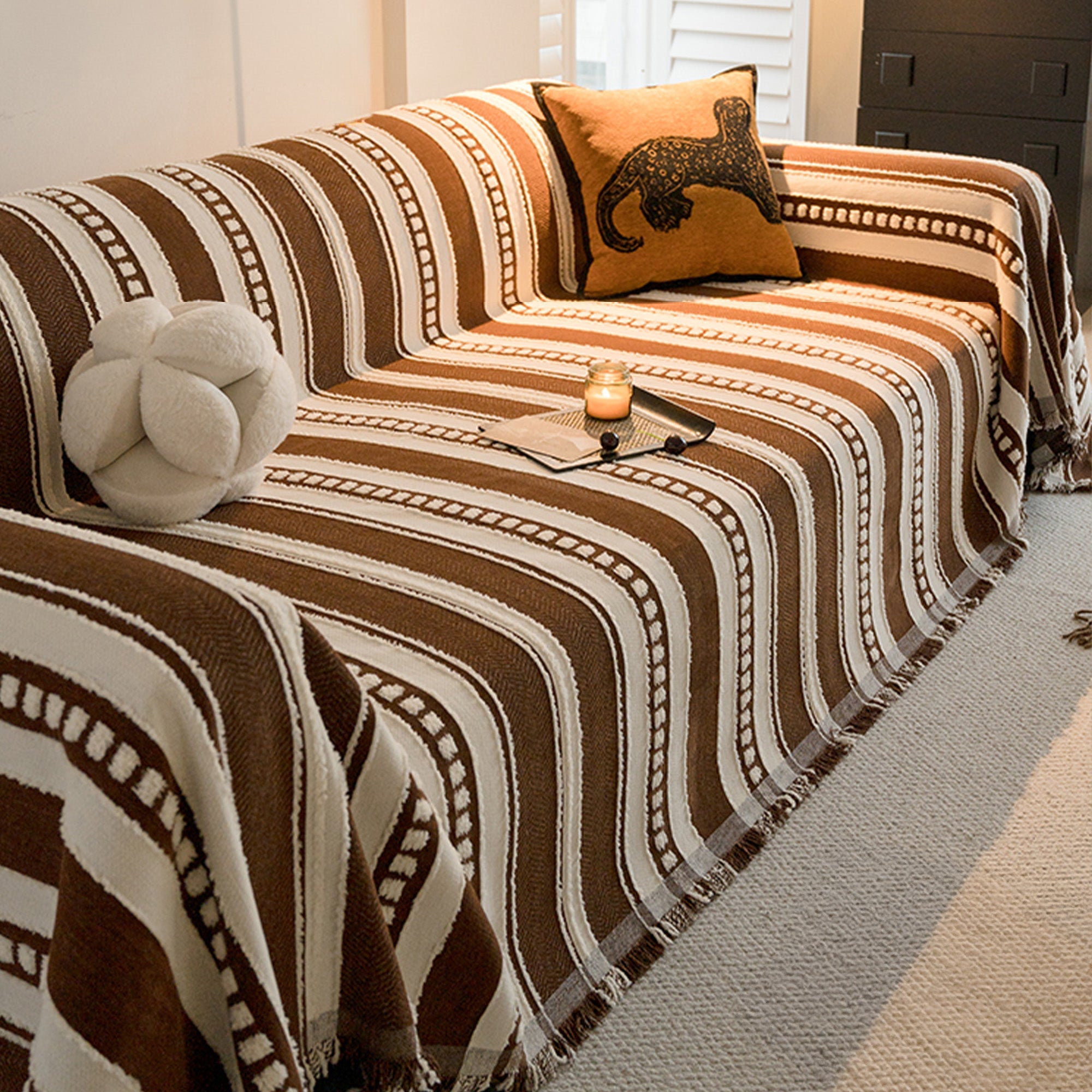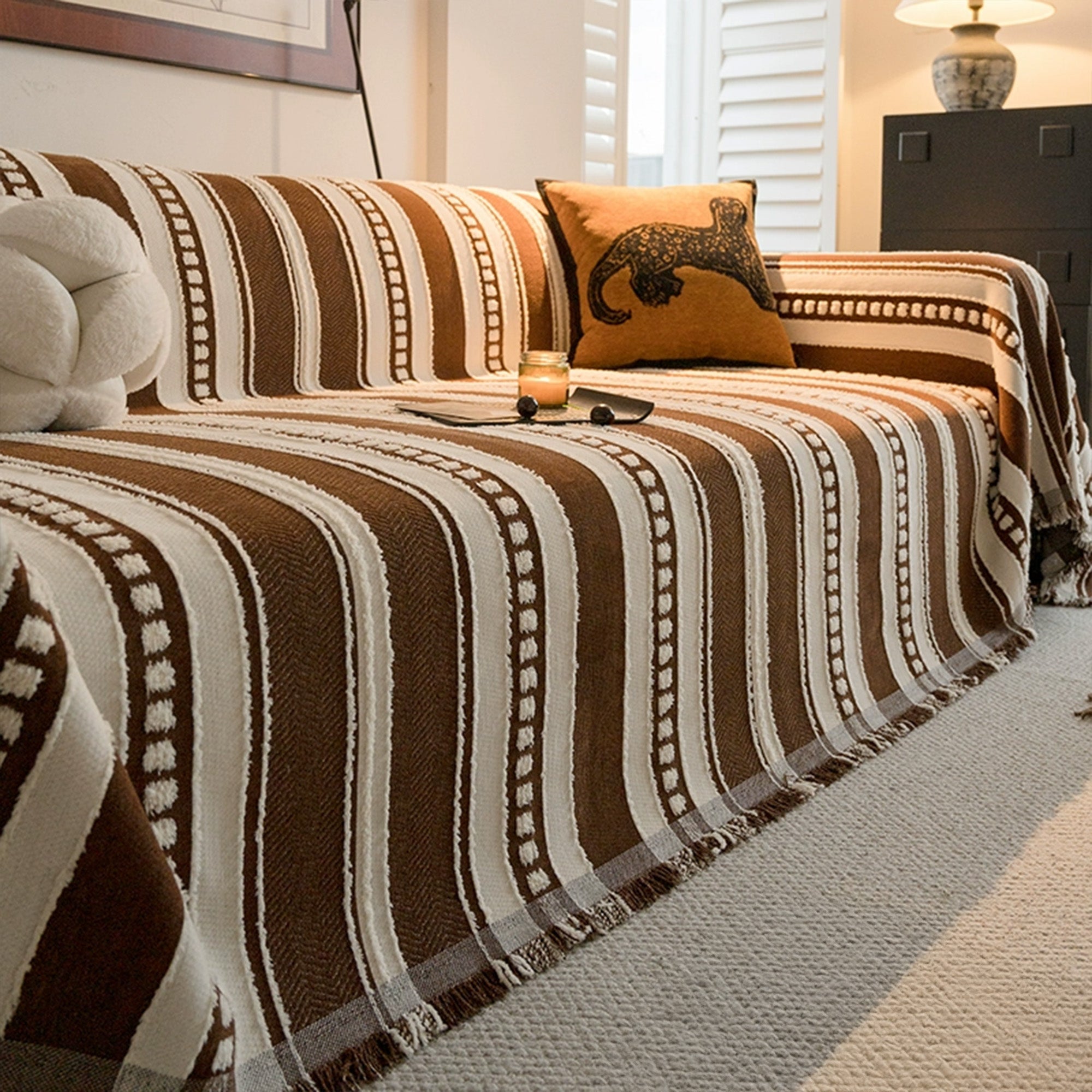 Der Savanna Rhythm Chenille-Sofabezug erinnert an die Wärme der Wüstenerde und die Kühnheit des Stammesrhythmus und verleiht jedem Wohnraum eine edle, haptische Note. Seine abwechselnd gewebten Streifen und erhabenen gepunkteten Bänder sind von der indigenen Textilkunst inspiriert und werden durch luxuriöse Chenillegarne und kontrastreiche Farbpaletten in moderne Interieurs übertragen. Mit seinen weichen Fransen ist dieser Bezug ebenso einladend wie auffällig – eine beeindruckende Mischung aus Komfort und Charakter.