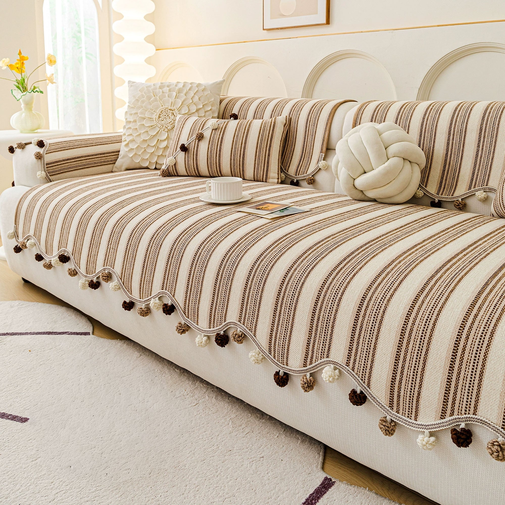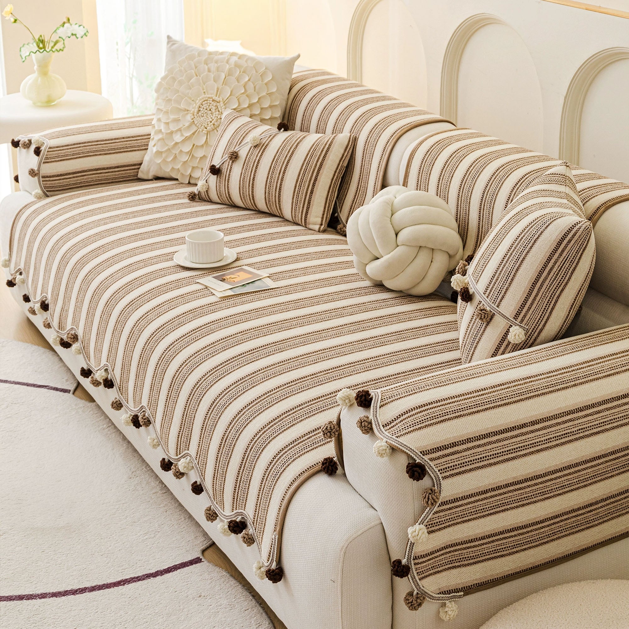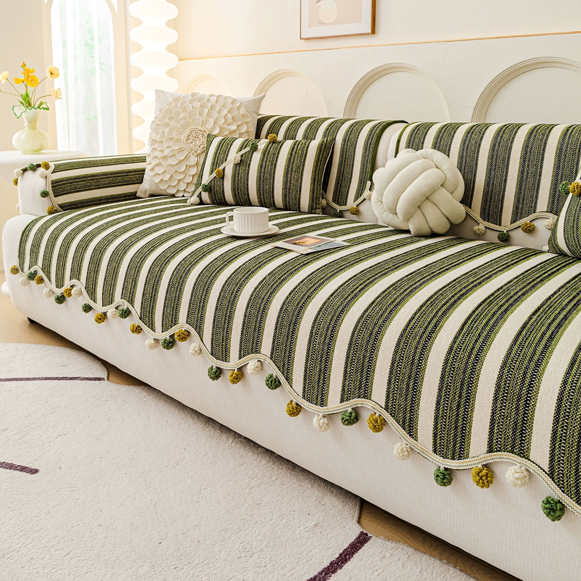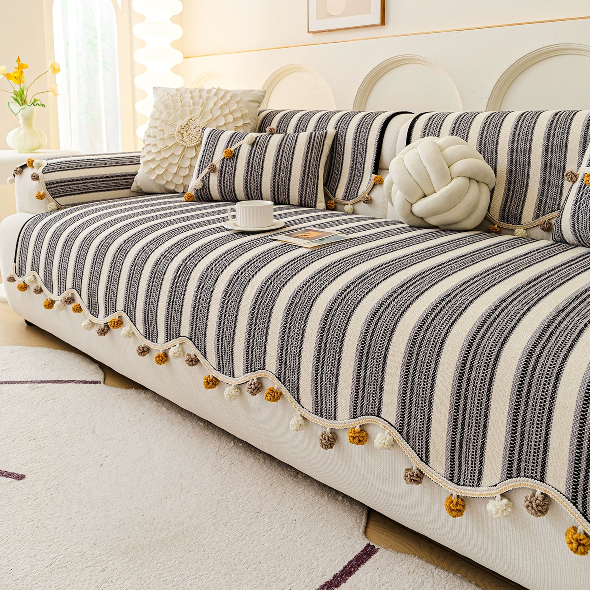 Bringen Sie verspielte Eleganz und Komfort in Ihren Wohnraum mit unserem rutschfesten Sofabezug Chic Stripe Pom-Pom. Mit seinem klassischen Streifenmuster und dem skurrilen Bommelrand verleiht dieser Bezug jedem Raum Charme und Stil.