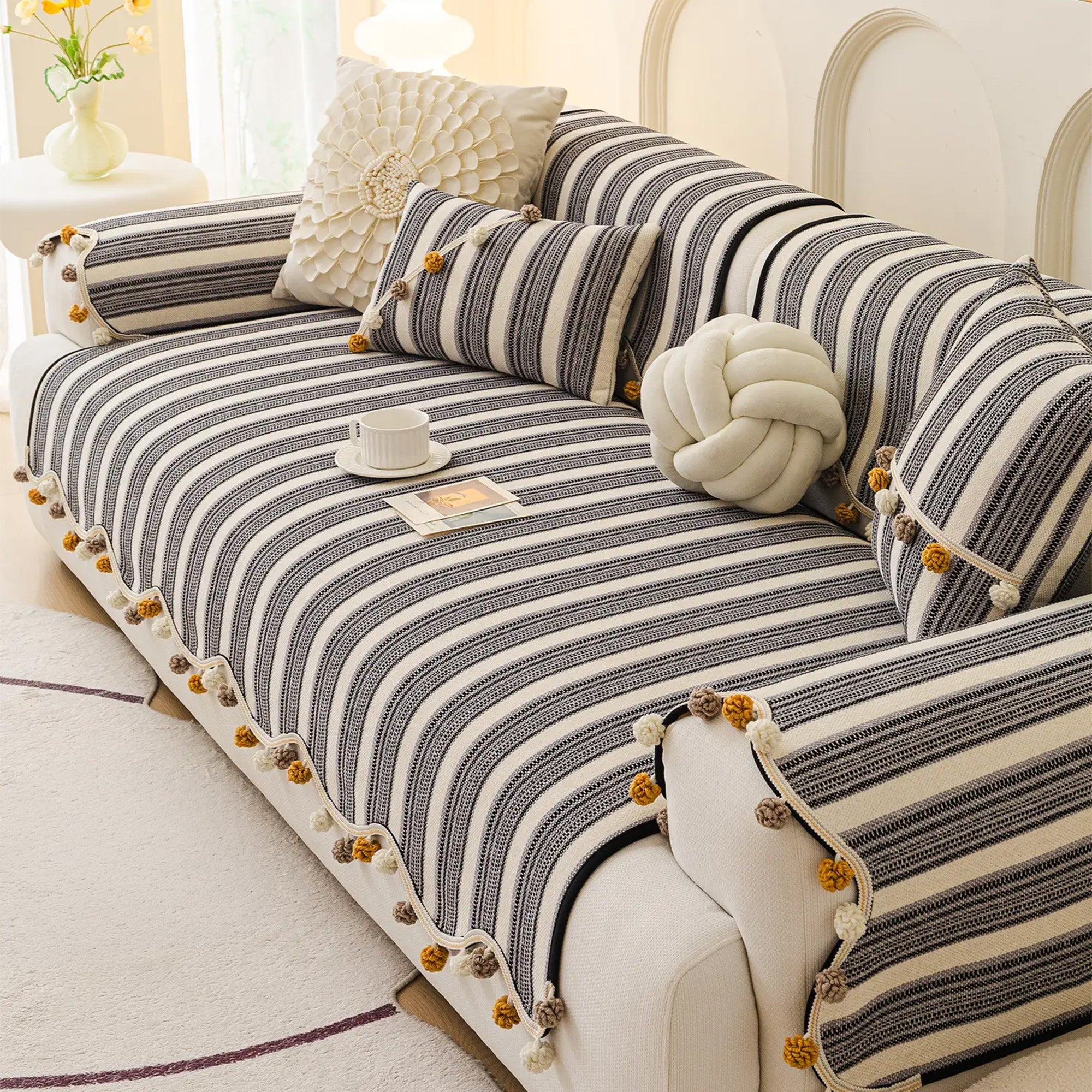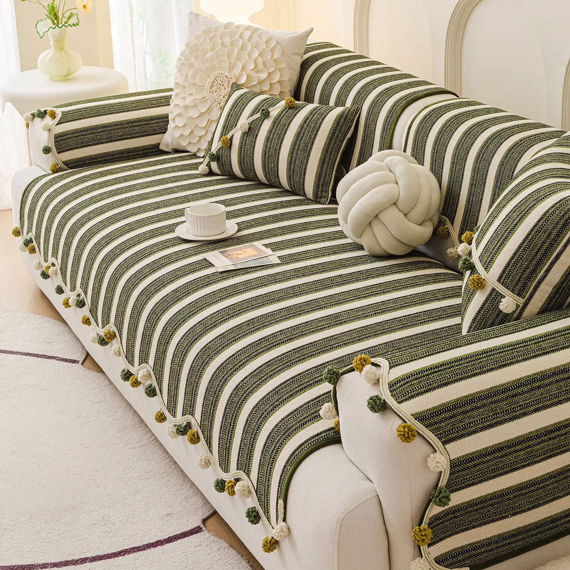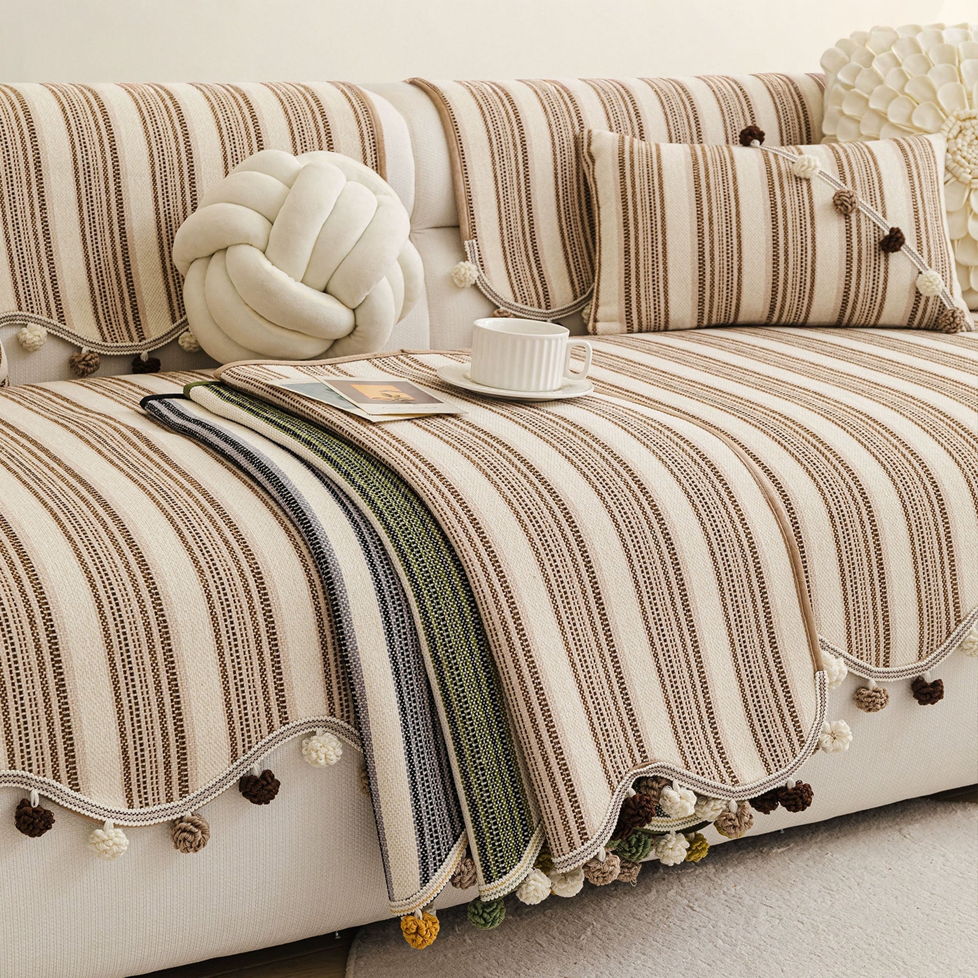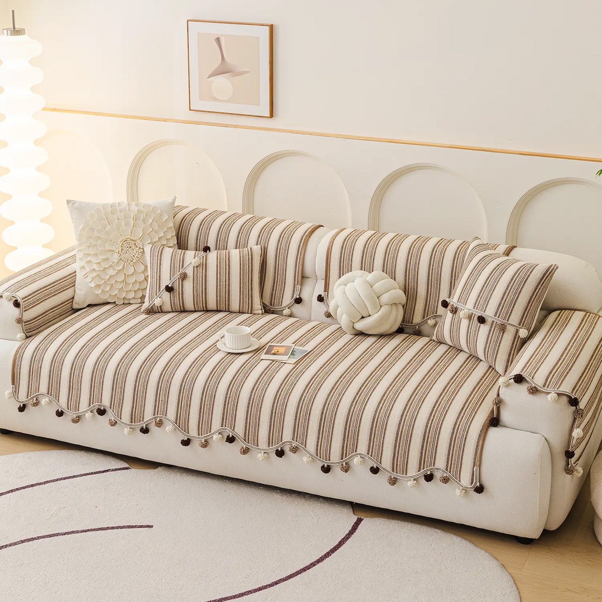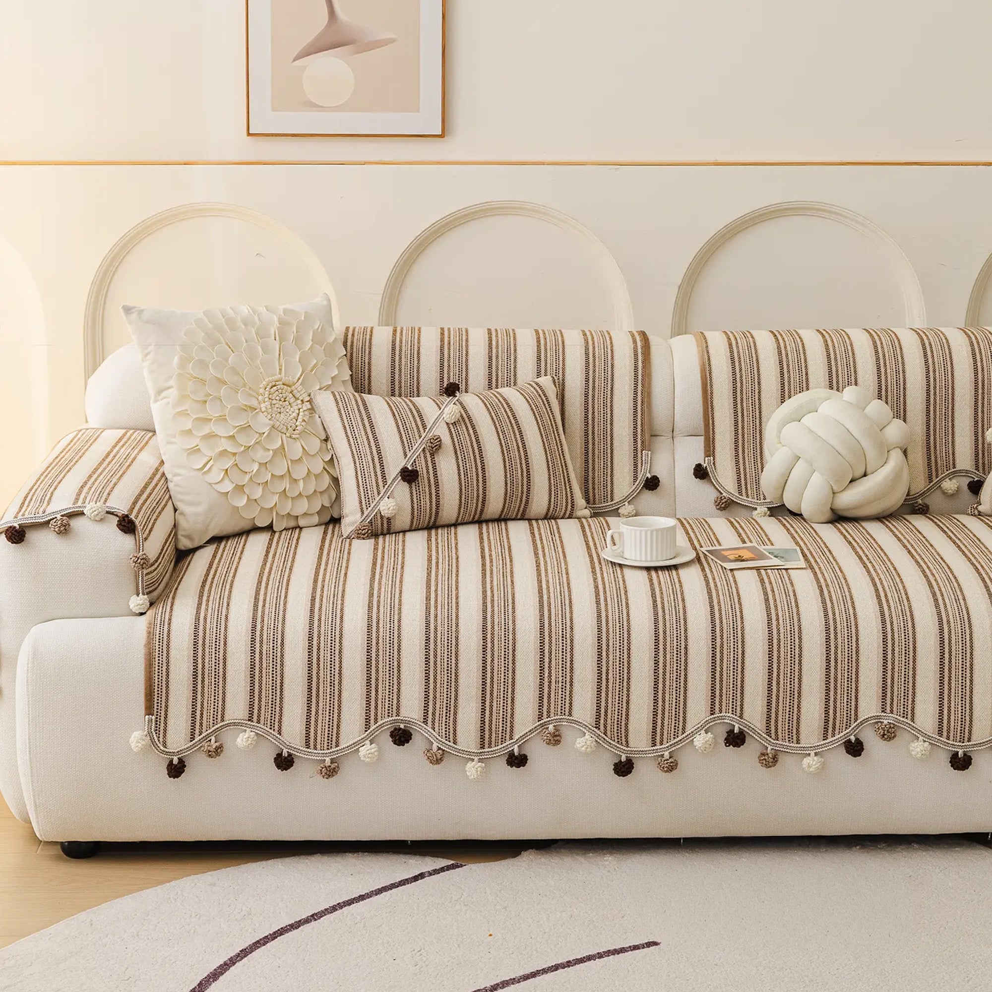 Bringen Sie verspielte Eleganz und Komfort in Ihren Wohnraum mit unserem rutschfesten Sofabezug Chic Stripe Pom-Pom. Mit seinem klassischen Streifenmuster und dem skurrilen Bommelrand verleiht dieser Bezug jedem Raum Charme und Stil.