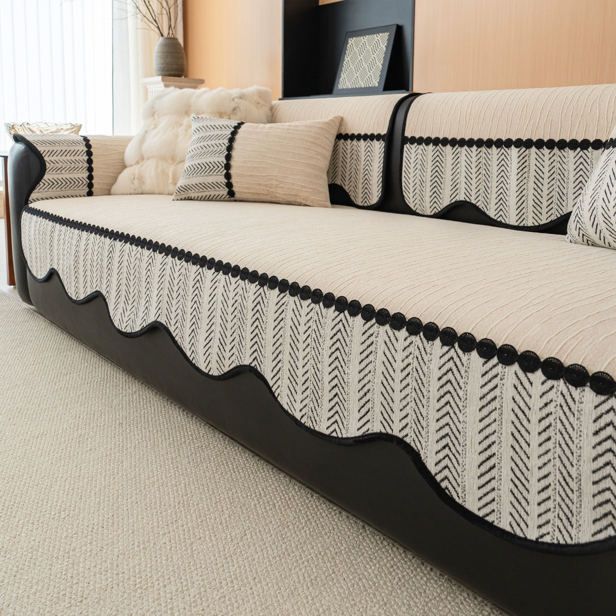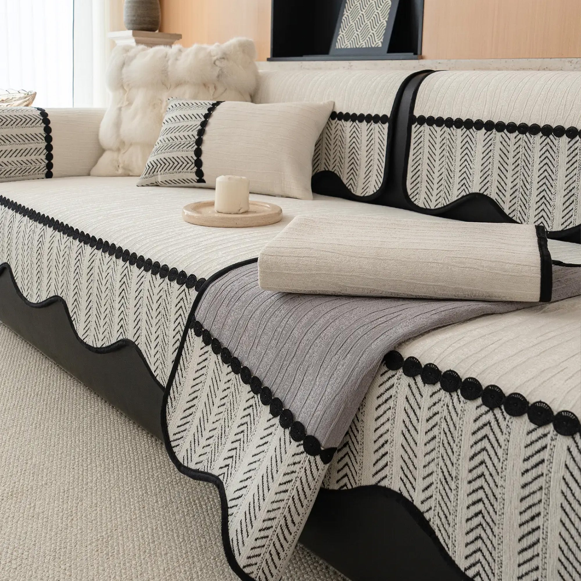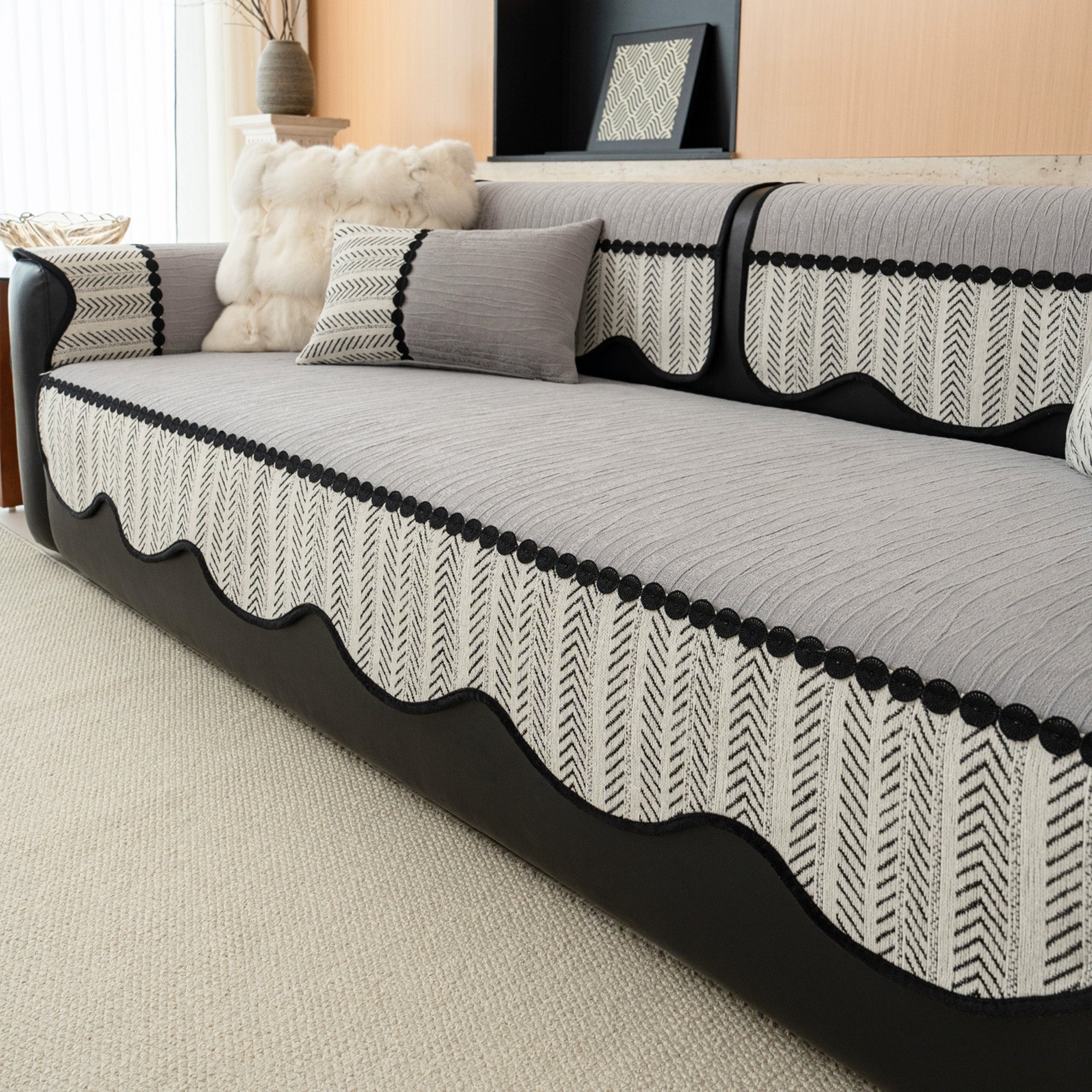 Werten Sie Ihre Wohnkultur mit dem rutschfesten Sofabezug „Geometric Charm Jacquard“ auf. Das markante Fischgrätenmuster mit kräftiger schwarzer Kante wertet Ihr Zuhause auf. Sein kunstvolles Muster vereint zeitlose Eleganz mit modernem Flair und setzt einen stilvollen Blickfang in jedem Wohnzimmer. Der Bezug aus hochwertigem Jacquardgewebe bietet Langlebigkeit und Komfort und ist gleichzeitig rutschfest. Perfekt zum Schutz Ihres Sofas vor täglicher Abnutzung, Tierhaaren oder verschütteten Flüssigkeiten und fügt sich nahtlos in moderne und klassische Interieurs ein.