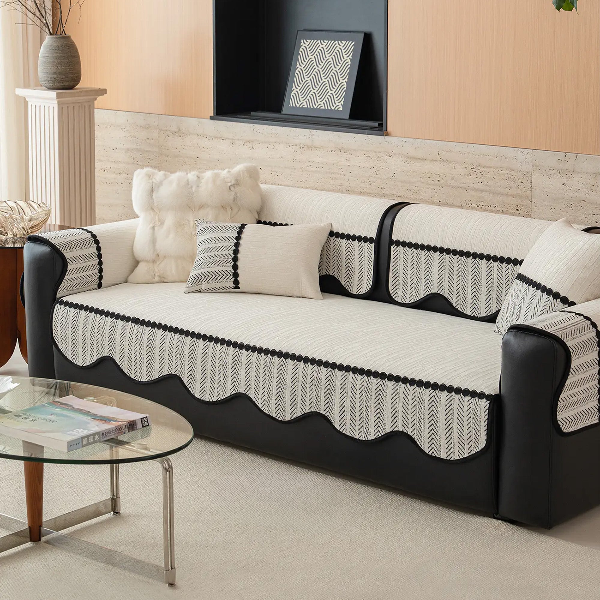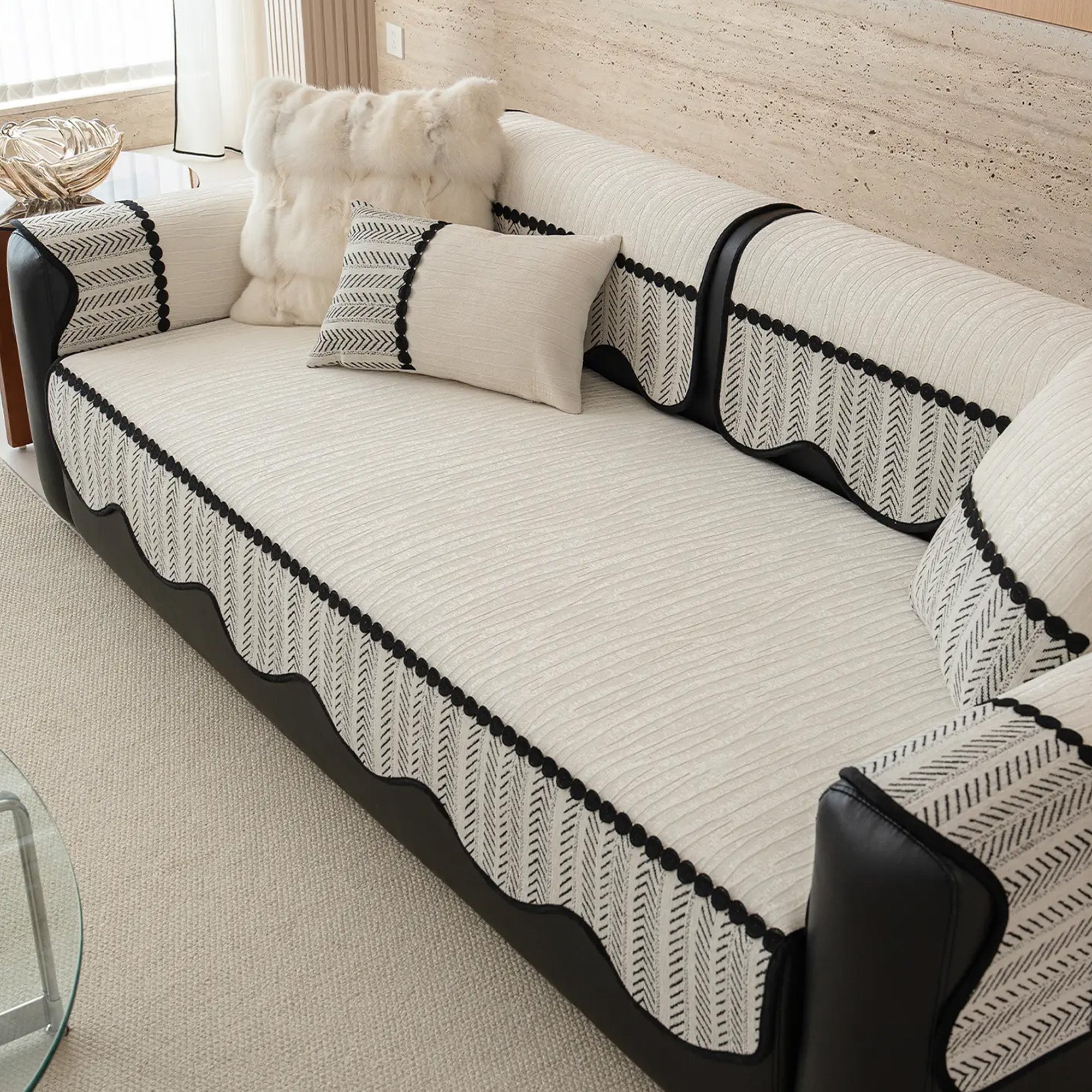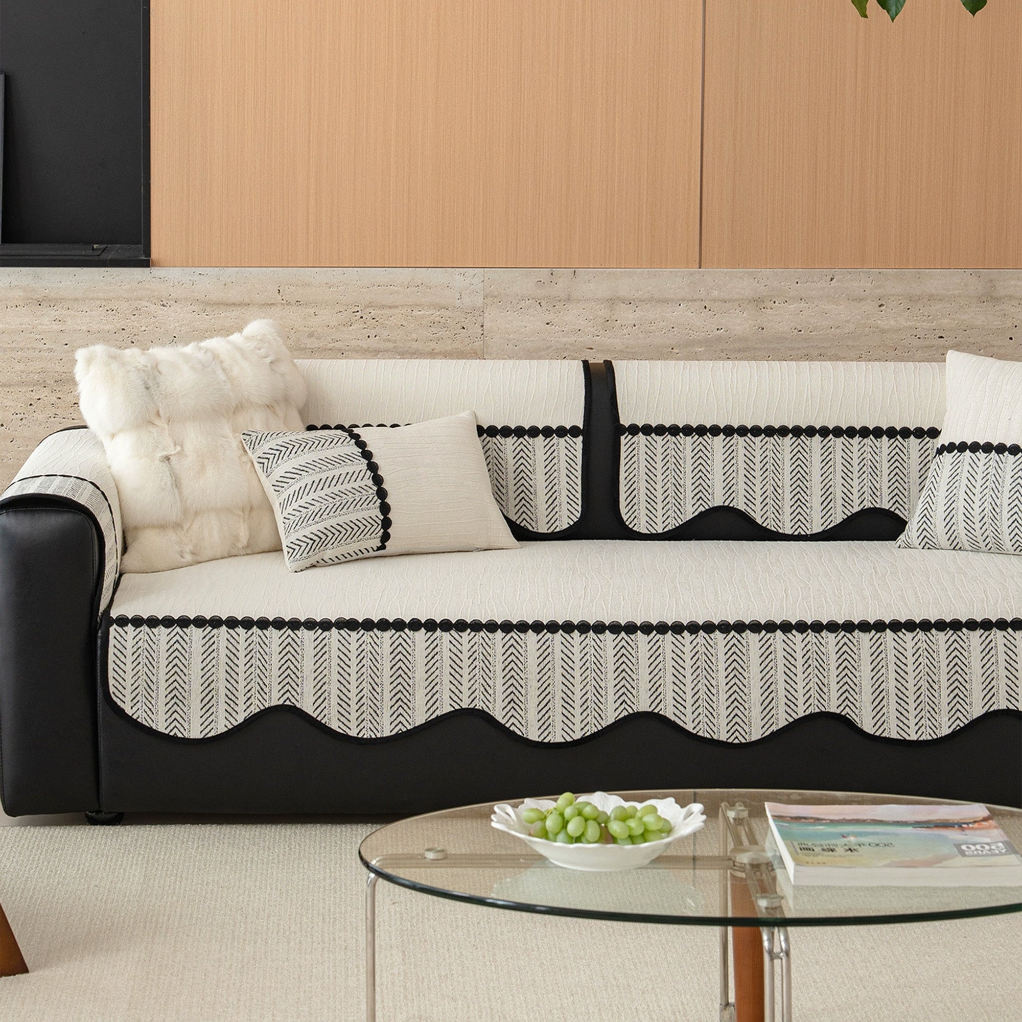 Werten Sie Ihre Wohnkultur mit dem rutschfesten Sofabezug „Geometric Charm Jacquard“ auf. Das markante Fischgrätenmuster mit kräftiger schwarzer Kante wertet Ihr Zuhause auf. Sein kunstvolles Muster vereint zeitlose Eleganz mit modernem Flair und setzt einen stilvollen Blickfang in jedem Wohnzimmer. Der Bezug aus hochwertigem Jacquardgewebe bietet Langlebigkeit und Komfort und ist gleichzeitig rutschfest. Perfekt zum Schutz Ihres Sofas vor täglicher Abnutzung, Tierhaaren oder verschütteten Flüssigkeiten und fügt sich nahtlos in moderne und klassische Interieurs ein.