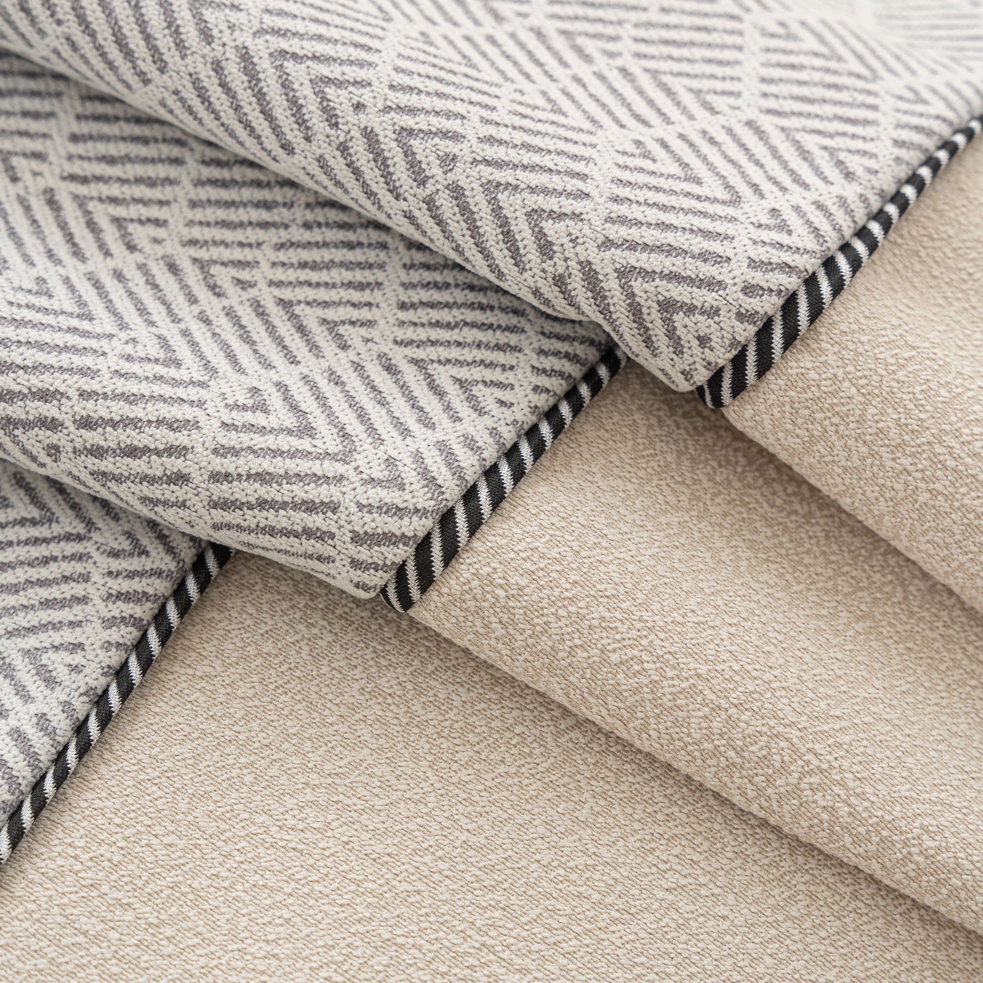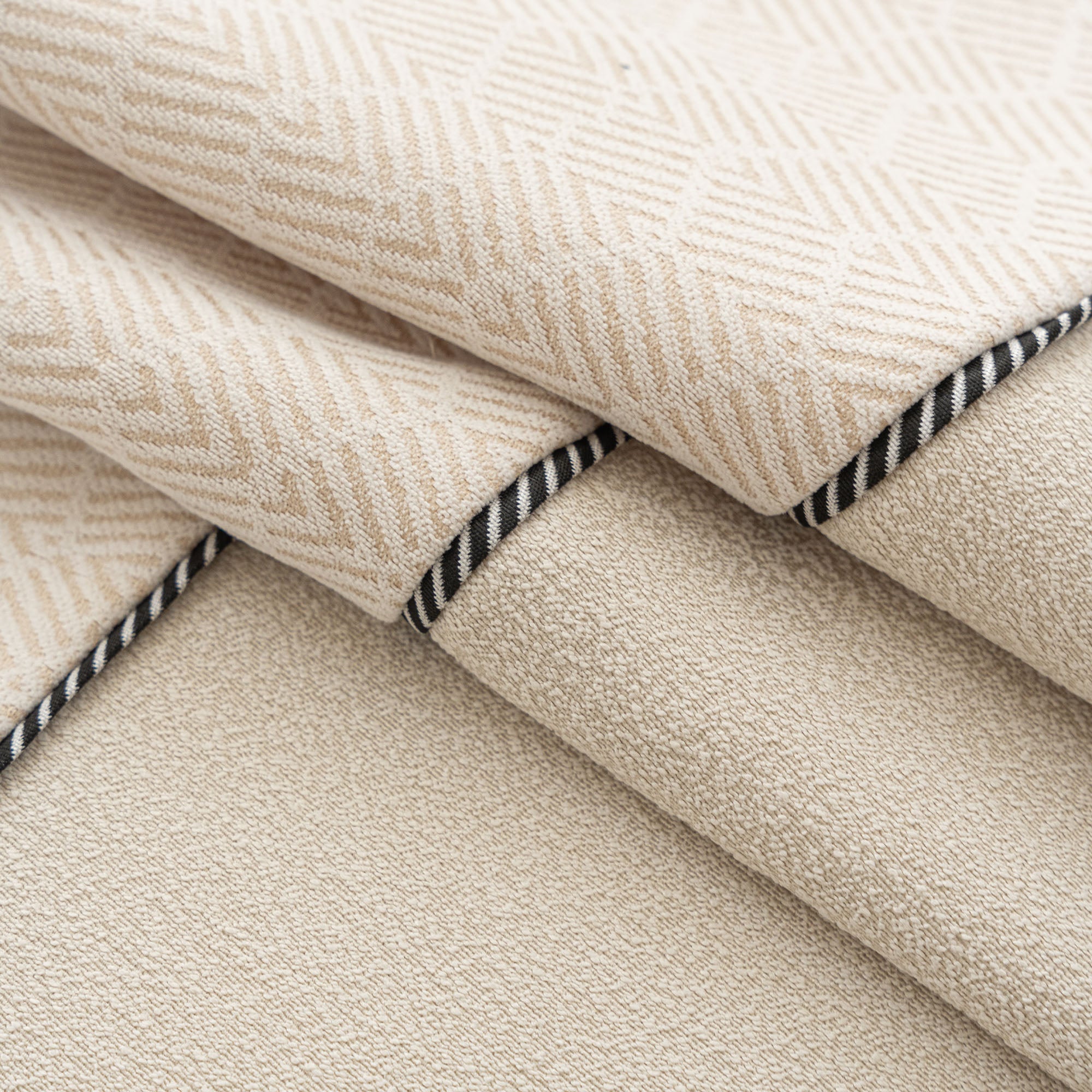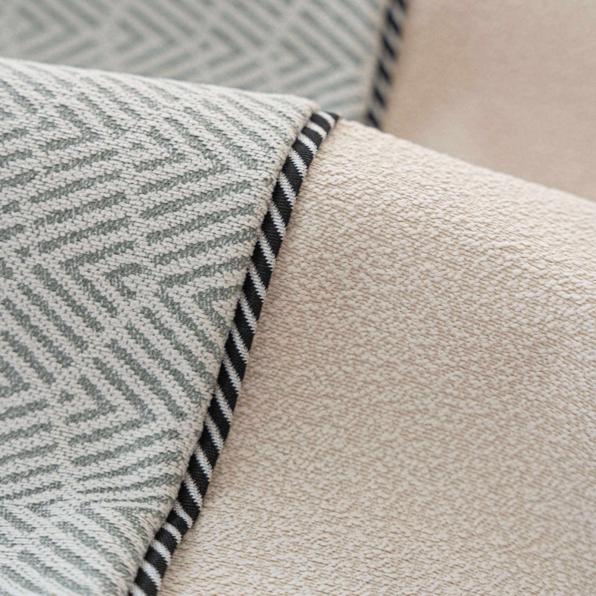 •Elegante Fischgrätenstruktur mit raffinierter Kontrastverzierung.