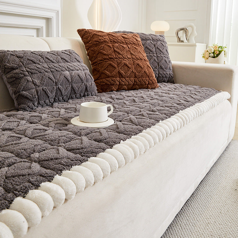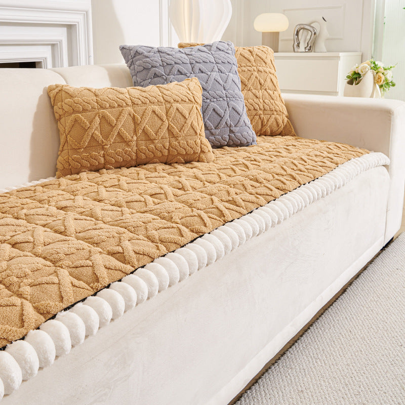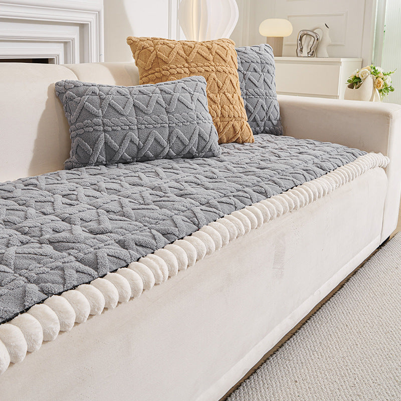 Verleihen Sie Ihrem Zuhause Wärme und Gemütlichkeit mit unserem rutschfesten Sofabezug aus Samt mit Geo-Muster – eine behagliche Kombination aus Eleganz und Komfort. Der dicke Kurzflorbezug mit geometrischem Prägemuster verleiht Ihrer Einrichtung Tiefe und Eleganz und schützt Ihre Möbel gleichzeitig zuverlässig.